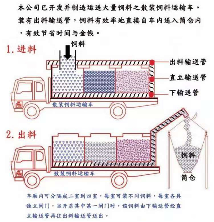 ★罐體內(nèi)可加裝分倉,可同時(shí)運(yùn)輸多種不同類的飼料或膨人介質(zhì)。部件標(biāo)準(zhǔn)化,容易維修保養(yǎng)。