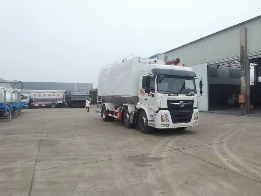 散裝飼料運輸車,散裝飼料車的飼料罐架設(shè)在卡車的底盤上,罐頂開有進料口.頂部的一根螺旋輸送卸料管(俗稱卸料絞龍)則可自由回轉(zhuǎn)和抬升,抬升的仰角可達60度。運輸時,頂部的螺旋管平臥在罐頂;卸料時則抬起,使管端的出料口與畜禽飼養(yǎng)場貯料罐頂部的進料門相接,駕駛室內(nèi)裝有操縱裝置(操縱裝置也可裝置在罐體尾部),卸料時通過車底的動力輸出軸和減速器來驅(qū)動螺旋,以完成卸料。