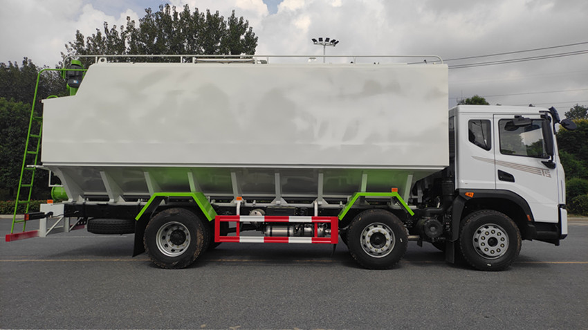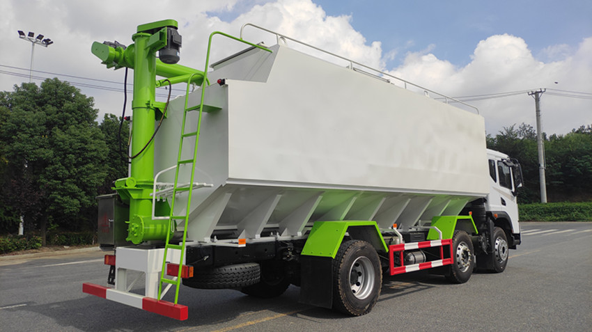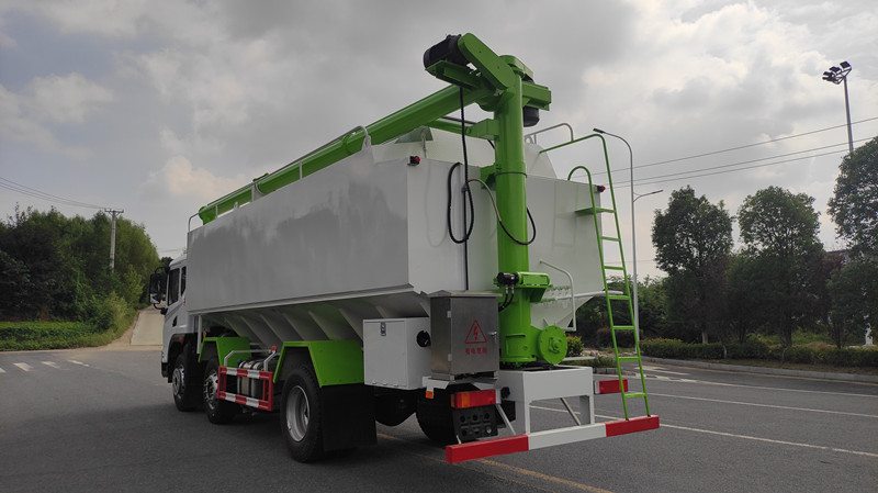 散裝飼料運(yùn)輸車,散裝飼料車的飼料罐架設(shè)在卡車的底盤上,罐頂開有進(jìn)料口.頂部的一根螺旋輸送卸料管(俗稱卸料絞龍)則可自由回轉(zhuǎn)和抬升,抬升的仰角可達(dá)60度。運(yùn)輸時(shí),頂部的螺旋管平臥在罐頂;卸料時(shí)則抬起,使管端的出料口與畜禽飼養(yǎng)場貯料罐頂部的進(jìn)料門相接,駕駛室內(nèi)裝有操縱裝置(操縱裝置也可裝置在罐體尾部),卸料時(shí)通過車底的動(dòng)力輸出軸和減速器來驅(qū)動(dòng)螺旋,以完成卸料。