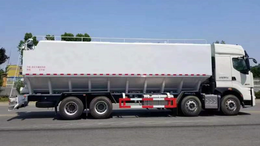 散裝飼料運(yùn)輸車,散裝飼料車的飼料罐架設(shè)在卡車的底盤上,罐頂開(kāi)有進(jìn)料口.頂部的一根螺旋輸送卸料管(俗稱卸料絞龍)則可自由回轉(zhuǎn)和抬升,抬升的仰角可達(dá)60度。運(yùn)輸時(shí),頂部的螺旋管平臥在罐頂;卸料時(shí)則抬起,使管端的出料口與畜禽飼養(yǎng)場(chǎng)貯料罐頂部的進(jìn)料門相接,駕駛室內(nèi)裝有操縱裝置(操縱裝置也可裝置在罐體尾部),卸料時(shí)通過(guò)車底的動(dòng)力輸出軸和減速器來(lái)驅(qū)動(dòng)螺旋,以完成卸料。